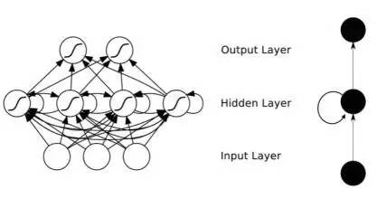 RNN示意圖, 同層神經元之間有相互連接,從而使得歷史信息在網絡里向回聲一般交替傳遞