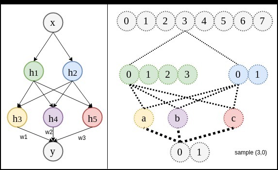 關系圖2:與網絡結構1不同,增加到4個節點后,每個節點都可以完全沒有變體,只取一個值。想法很合理,但實際訓練時,模型不按照該方式工作。