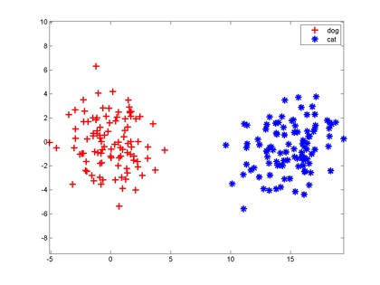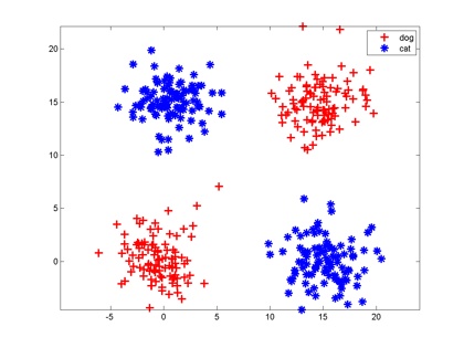 王小龍數學話題優秀回答者 數學,計算機視覺,圖形圖像處理收錄于 知乎周刊 、 編輯推薦 ?4320 人贊同神經網絡很萌的!0. 分類神經網絡最重要的用途是分類,為了讓大家對分類有個直觀的認識,咱們先看幾個例子:垃圾郵件識別:現在有一封電子郵件,把出現在里面的所有詞匯提取出來,送進一個機器里,機器需要判斷這封郵件是否是垃圾郵件。疾病判斷:病人到醫院去做了一大堆肝功、尿檢測驗,把測驗結果送進一個機器里,機器需要判斷這個病人是否得病,得的什么病。貓狗分類:有一大堆貓、狗照片,把每一張照片送進一個機器里,機器需要判斷這幅照片里的東西是貓還是狗。這種能自動對輸入的東西進行分類的機器,就叫做分類器。分類器的輸入是一個數值向量,叫做特征(向量)。在第一個例子里,分類器的輸入是一堆0、1值,表示字典里的每一個詞是否在郵件中出現,比如向量(1,1,0,0,0......)就表示這封郵件里只出現了兩個詞abandon和abnormal;第二個例子里,分類器的輸入是一堆化驗指標;第三個例子里,分類器的輸入是照片,假如每一張照片都是320*240像素的紅綠藍三通道彩色照片,那么分類器的輸入就是一個長度為320*240*3=230400的向量。分類器的輸出也是數值。第一個例子中,輸出1表示郵件是垃圾郵件,輸出0則說明郵件是正常郵件;第二個例子中,輸出0表示健康,輸出1表示有甲肝,輸出2表示有乙肝,輸出3表示有餅干等等;第三個例子中,輸出0表示圖片中是狗,輸出1表示是貓。分類器的目標就是讓正確分類的比例盡可能高。一般我們需要首先收集一些樣本,人為標記上正確分類結果,然后用這些標記好的數據訓練分類器,訓練好的分類器就可以在新來的特征向量上工作了。1. 神經元咱們假設分類器的輸入是通過某種途徑獲得的兩個值,輸出是0和1,比如分別代表貓和狗。現在有一些樣本:大家想想,最簡單地把這兩組特征向量分開的方法是啥?當然是在兩組數據中間畫一條豎直線,直線左邊是狗,右邊是貓,分類器就完成了。以后來了新的向量,凡是落在直線左邊的都是狗,落在右邊的都是貓。一條直線把平面一分為二,一個平面把三維空間一分為二,一個n-1維超平面把n維空間一分為二,兩邊分屬不同的兩類,這種分類器就叫做神經元。大家都知道平面上的直線方程是