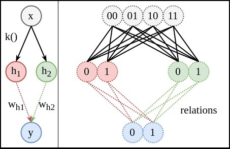 表示sigmoid函數。(只要是非線性即可,relu是目前的主流)說明:下圖右側中的虛線表示的既不是神經網絡的鏈接,也不是函數中的映射,而是兩個空間中,所有可能值之間的關系(relation)。學習的目的是確定這些狀態的關系。比如當輸入00時,模型要嘗試告訴我們00到1的概率為0,00到0的概率為1,這樣熵