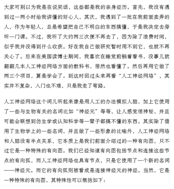 大家可別以為我是在說笑話,這些都是我的親身經歷。首先,我沒有遇到過一兩小時給我講懂的好心人,其次我遇到了一批在我前面賣弄的人,作為年輕人,總是希望把自己不明白的東西搞懂,于是我決定去旁聽一門課。不過,我聽了大約兩三次便不再去了,因為除了浪費時間,似乎我并沒得到什么收獲。好在我自己做研究暫時用不到它,也就不再關心了。后來在美國讀博士期間,我喜歡在睡覺前躺著看書,沒事兒就捧著幾本關于人工神經網絡的教科書在床上看,居然也看懂了。然后再用它做了兩三個項目,算是學會了。到這時回過頭來再看“人工神經網絡”,其實并不復雜,入門也不難,只是我走了彎路。——吳軍】