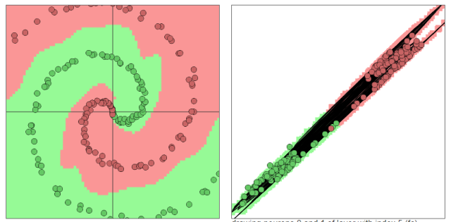 的形狀直接倒置了。不過還需要考慮激活函數。(1)中用的是linear。在(2)中,當換成sigmoid時,你會發現沒有黃色區域了。因為sigmoid的值域是(0,1)(1)(2)輸出:黃色背景顏色都被歸為黃點類,藍色背景顏色都被歸為藍點類。深淺表示可能性的強弱。上圖中所有在黃色背景顏色的點都會被分類為“黃點“,同理,藍色區域被分成藍點。在上面的分類分布圖中你可以看到每一層通過上一層信息的組合所形成的。權重(那些連接線)控制了“如何組合”。神經網絡的學習也就是從數據中學習那些權重。Tensorflow playground所表現出來的現象就是“在我文章里所寫的“物質組成思想”,這也是為什么我把Tensorflow playground放在了那一部分。不過你要是把Tensorflow的個名字拆開來看的話,是tensor(張量)的flow(流動)。Tensorflow playground的作者想要闡述的側重點是“張量如何流動”的。5種空間變換的理解:Tensorflow playground下沒有體現5種空間變換的理解。需要打開這個網站嘗試:ConvNetJS demo: Classify toy 2D data左側是原始輸入空間下的分類圖,右側是轉換后的高維空間下的扭曲圖。最終的扭曲效果是所有綠點都被扭曲到了一側,而所有紅點都被扭曲到了另一側。這樣就可以線性分割(用超平面(這里是一個平面)在中間分開兩類)深層學習為何要“Deep”(下)