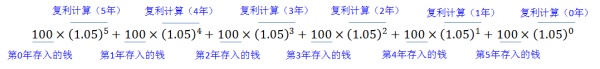 以此類推,如果小明每年都往銀行中存入新的100元錢,那么這個收益表格將是這樣的:<img src="https://pic2.zhimg.com/cfe98b9d33640fae02a21bf369f0459d_b.jpg" data-rawwidth="1296" data-rawheight="284" class="origin_image zh-lightbox-thumb" width="1296" data-original="https://pic2.zhimg.com/cfe98b9d33640fae02a21bf369f0459d_r.jpg">可見,最終小明拿到的錢將等于他各年存入的錢分別計算復利之后得到的錢數的總和,即: