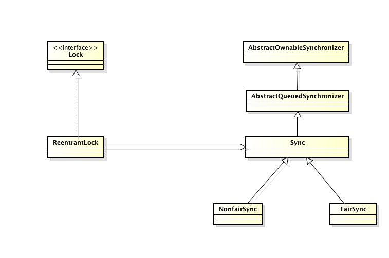 接下來,我們將圍繞lock和unlock這兩個方法,來介紹整個ReentrantLock是怎么工作的。在介紹ReentrantLock之前,我們首先來看一下ReentrantLock的類層次結構以及和它密切相關的AbstractQueuedSynchronizer