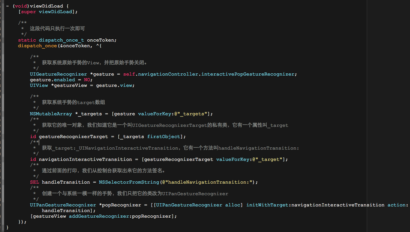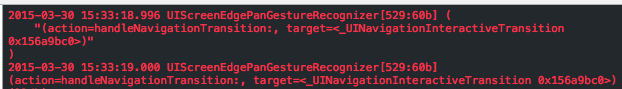 我們繼續(xù)看它的log。控制臺除了打印了它的類,還打印了它的觸發(fā)target:_UINavigationInteractiveTransition(這是一個私有類,看來是專門用來做導(dǎo)航控制器交互動畫的),和action:handleNavigationTransition(這是它的一個私有方法),我們要做的就是新建一個UIPanGestureRecognizer,讓它的觸發(fā)和系統(tǒng)的這個手勢相同,這就需要利用runtime獲取系統(tǒng)手勢的target和action。