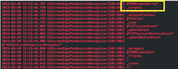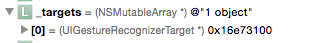 通過log我們可以看到,UIGestureRecognizer有一個叫_targets的屬性,它的類型為NSMutableArray。