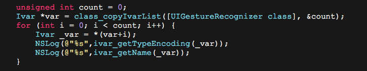 那么如何獲取這個target呢?一開始我用kvc想直接獲取這個手勢的target,程序崩潰了,原來它根本沒有這樣一個屬性。所以我能想到的是,先利用runtime遍歷它的所有成員變量,看看系統(tǒng)是怎么存儲這個屬性的,