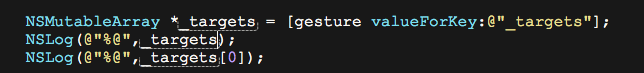 它是用數(shù)組來存儲每一個target-action,所以可以動態(tài)的增加手勢觸發(fā)對象。那么又是什么存儲每一個target-action呢?為了了解這個我們拿到這個屬性的名字"_targets"通過kvc獲取它,接著打印出來。