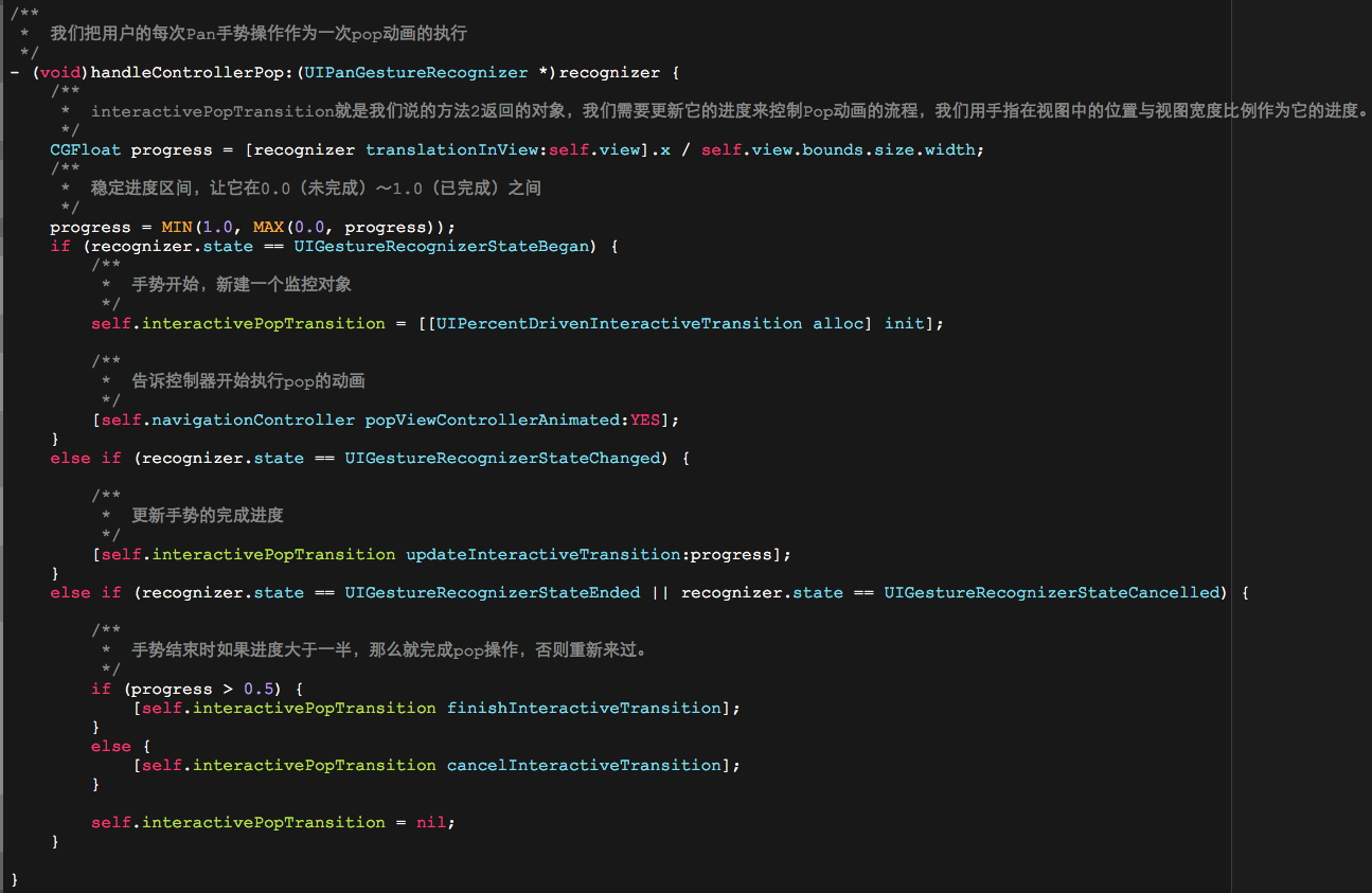 再來看方法2,我們需要返回一個遵守了UIViewControllerInteractiveTransitioning協(xié)議的對象(提示一下,這兩個協(xié)議容易混淆,要注意區(qū)分,一個是負責(zé)動畫,一個是負責(zé)交互過程),蘋果已經(jīng)有一個類專門處理這個功能,它叫UIPercentDrivenInteractiveTransition,當(dāng)然你也可以自定義一個這樣的類。我們可以這樣理解它的作用:前面在方法1中返回的動畫,會在執(zhí)行的過程中被系統(tǒng)分解以用于用戶交互,這個交互過程的動畫完成度就由它來調(diào)控。下面我們來看一下如何使用它。(為了讓控制器視圖拖動,我們給控制器的視圖加了一個拖動手勢,在拖動方法里我們對這個對象進行操作)