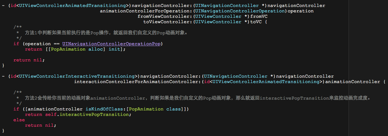 其實這個拖動過程屬于導(dǎo)航控制器的動畫,所以我們需要重寫UINavigationController的兩個代理方法,navigationController:animationControllerForOperation:fromViewController:toViewController:(名字很長下面就稱為方法1)和
