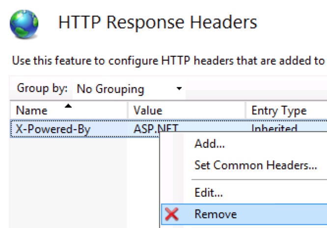 在web.config的<htt 3. 移除X-AspNetMvc-Version 在 Application_Start() 中添加如下代碼: 4. 移除X-Powered-By 在IIS Manager的HTTP Response Headers中移除X-Powered-By: 【參考資料】 Remove Unwanted HTTP Response Headers<httpRuntime enableVersionHeader="false" />