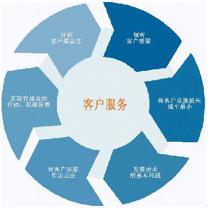 客戶服務(wù)不僅限于把公司提供給客戶使用。客戶服務(wù)是與客戶交互的一個(gè)完整過程,包括聽取客戶的問題和要求,對客戶的需要作出反應(yīng)并探詢客戶新的需求。我們真的不能將其看成一個(gè)簡單的過程。客戶服務(wù)可以用一個(gè)復(fù)雜的循環(huán)來表示,其中不僅僅包括了客戶和客戶服務(wù)部門,實(shí)際上包括了整個(gè)公司,即把公司整體作為一個(gè)受客戶需求驅(qū)動的對象。