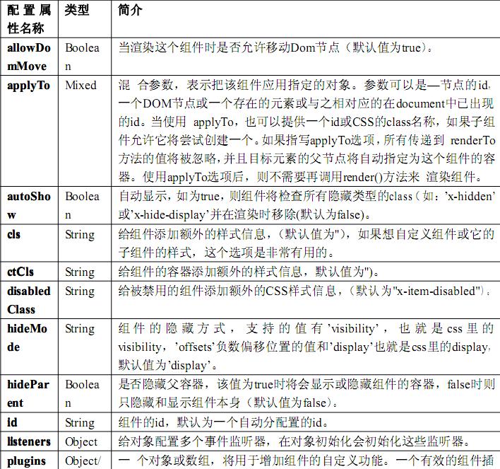 function panel(){ var params={ title:"Hello", width:300, height:200, html:"<h1>一個(gè)面板</h1>", items:[ new Ext.Panel({title:"Panel1",height:100}), new Ext.Panel({title:"Panel2",height:100}) ] }; var panel=new Ext.Panel(params); panel.render("panel"); } 如果需要讓組件顯示出不同的效果,我們就需要通過構(gòu)造函數(shù)中的參數(shù)設(shè)置。 由于組件都繼承自Ext.Component,因此所有組件可能有共同的屬性,如下圖