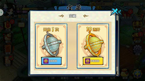 在游戲操作界面右上角,有一個“寶藏”的圖標,點擊打開寶藏探索界面。這個時候你可以看見一個綠色的旋轉的球,和一個黃色的旋轉的球。點擊綠色旋轉的球,是通過消耗金幣來進行寶藏探索,點擊黃色旋轉的球,是通過消耗勾玉來進行寶藏探索。以上兩種寶藏探索都是可以選擇開啟1次或者是10連開。