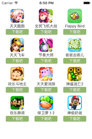 #import "ViewController.h"#import "AppInfo.h"#import "AppView.h"#define kAppViewW 80#define kAppViewH 90#define kColCount 3#define kStartY 20@interface ViewController ()/** 應(yīng)用程序列表 */@property (nonatomic, strong) NSArray *appList;@end@implementation ViewController- (NSArray *)appList{ if (_appList == nil) { _appList = [AppInfo appList]; } return _appList;}- (void)viewDidLoad{ [super viewDidLoad]; // 搭建九宮格 // 320 - 3 * 80 = 80 / 4 = 20 CGFloat marginX = (self.view.bounds.size.width - kColCount * kAppViewW) / (kColCount + 1); CGFloat marginY = 10; for (int i = 0; i < self.appList.count; i++) { // 行 int row = i / kColCount; // 列 int col = i % kColCount; CGFloat x = marginX + col * (marginX + kAppViewW); CGFloat y = kStartY + marginY + row * (marginY + kAppViewH); //加載第i個(gè)xib視圖 AppView *appView = [AppView appViewWithAppInfo:self.appList[i]]; // 設(shè)置視圖位置 appView.frame = CGRectMake(x, y, kAppViewW, kAppViewH); [self.view addSubview:appView]; }}5. 本項(xiàng)目必須掌握的代碼段