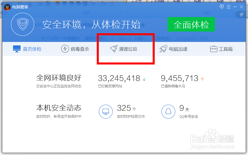 1,對(duì)于一些卸載后自動(dòng)殘留的卸載文件,想要進(jìn)行深度清理的話,我們不需要手動(dòng)操作,借助一些第三方軟件就能解決,先下載安裝并打開(kāi)騰訊電腦管家,找到清理垃圾功能。