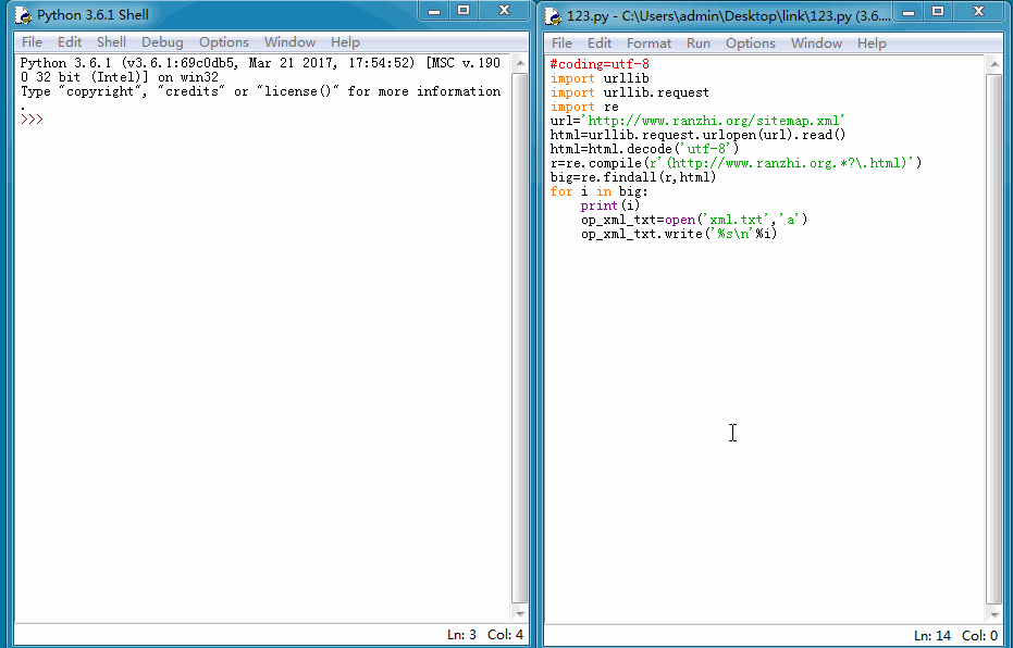#coding=utf-8import urllibimport urllib.request import reurl='http://www.ranzhi.org/sitemap.xml'html=urllib.request.urlopen(url).read()html=html.decode('utf-8')r=re.compile(r'(http://www.ranzhi.org.*?/.html)')big=re.findall(r,html)for i in big: print(i) op_xml_txt=open('xml.txt','a') op_xml_txt.write('%s/n'%i)我們能來看一下運行結果: