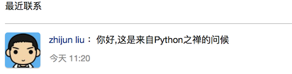 from zhihu import Zhihuif __name__ == '__main__': zhihu = Zhihu() profile = zhihu.user("xiaoxiaodouzi") _id = profile.get("id") zhihu.send_message(_id, "你好,這是來(lái)自Python之禪的問(wèn)候")執(zhí)行完成后,小號(hào)成功收到我發(fā)送的私信。