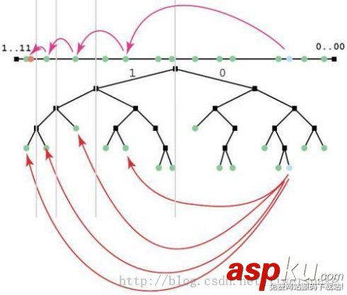 4. 根據上述算法,DHT中的查詢是跳躍式查詢,可以迅速的跨越的的節點桶而接近目標節點桶。之所以在遠處能夠大幅度跳躍,而在近處只能小幅度跳躍,原因是每個節點的路由表中離自身越接近的節點保存得越多,如下圖