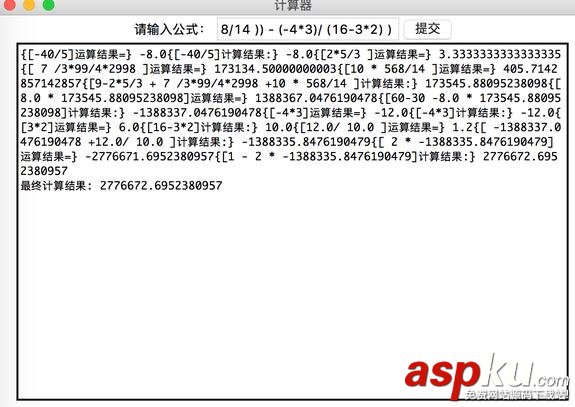 用戶輸入 1 - 2 * ( (60-30 +(-40/5) * (9-2*5/3 + 7 /3*99/4*2998 +10 * 568/14 )) - (-4*3)/ (16-3*2) )等類似公式后,必須自己解析里面的(),+,-,*,/符號和公式,運算后得出結果,結果必須與真實的計算器所得出的結果一致