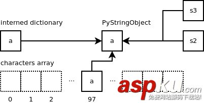 內容為 ‘a' 的字符串對象將被添加到 “interned” 字典中。字典中鍵(key)是一個指向該字符串對象的指針,而對應的值 就是一個相同的指針。在數組 “characters” 中,這一新的字符串對象在偏移量為 97 的位置被引用,因為字符 ‘a' 的ASCII碼值便是 97。變量 “s2” 也指向了這一字符串對象。