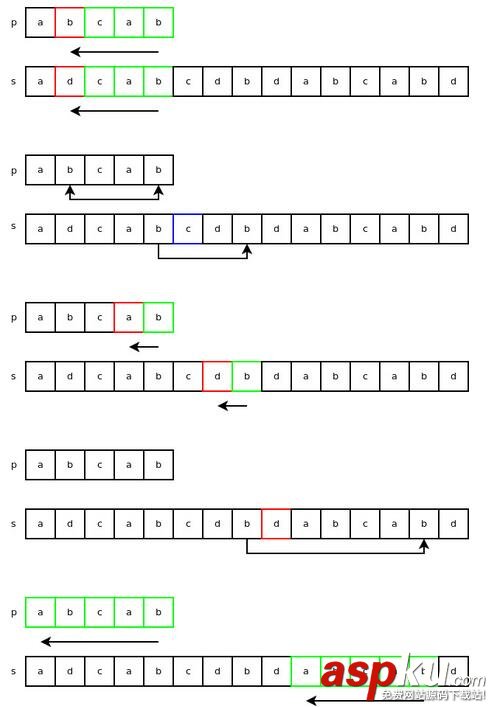 下面來看看,對于字符串 “p” 和 “s” 的匹配,算法具體是如何運行的。前三個步驟與上面類似,接著,字符 ‘d' 在字符串 “p” 并未找到,因此我們直接跳過等于“p”字符串長度的字符數,之后便迅速找到了一個匹配。