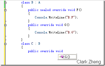 由于類 B 中對 F 方法進行了密封, 類 C 在繼承類 B 時只能重寫一個函數,如圖所示: