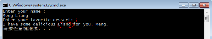 cin把Meng作為第一個字符串,并放到數組中,把Liang放到輸入隊列中第二次輸入時,發現輸入隊列Liang,因為cin讀取Liang,并將它放到dessert數組中