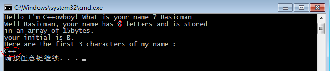 # include <iostream># include <cstring># define SIZE 15using namespace std;int main(void){ char name_cin[SIZE]; char name[SIZE] = "C++owboy"; //initialized array cout << "Hello I'm " << name; cout << "! What is your name ? "; cin >> name_cin; cout << "Well " << name_cin << ", your name has "; cout << strlen(name_cin) << " letters and is stored " << endl; cout << "in an array of " << sizeof(name_cin) << "bytes." << endl; cout << "your initial is " << name_cin[0] << "." << endl; name[3] = '/0'; cout << "Here are the first 3 characters of my name : "; cout << name << endl; return 0;}大家猜猜結果呢?
