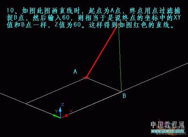 10、如圖此圖畫直線時,起點為A點,終點用點過濾捕捉B點,然后輸入60,則相當于是說終點的坐標中的XY值和B點一樣,Z值為60。這樣得到如圖紅色的直線。