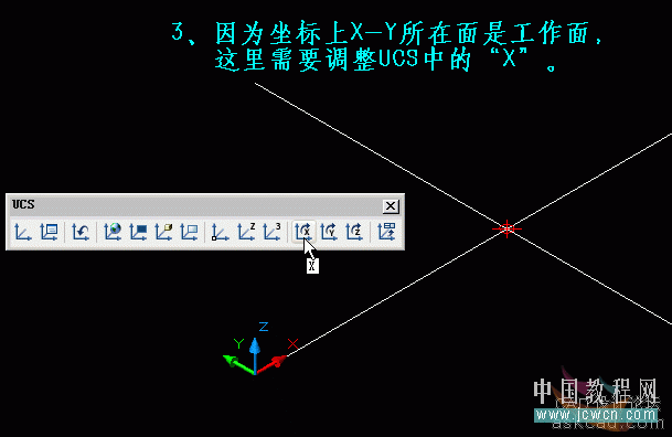 3、因為坐標上X-Y所在面是工作面,這里需要調(diào)整UCS中的“X”。
