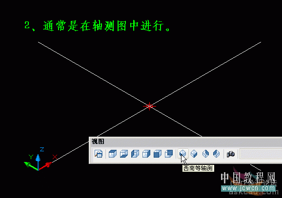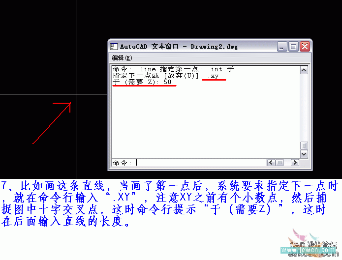 7、比如畫這條直線,當畫了第一點后,系統(tǒng)要求指定下一點時,就在命令行輸入“XY”,注意XY之前有個小數(shù)點,然后捕捉圖中十字交叉點,這時命令行提示“于(需要Z)”,這時在后面輸入直線的長度。