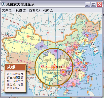 縮小地圖以適應頁面大小的局限,用放大鏡來放大縮小了的地圖,使能清晰的看到需要的細節。使用AS糾正普通遮罩制作放大鏡錯位較大的缺陷,放大部分在鏡片的中心(紅十字處)沒有錯位。用鼠標經過、離開按鈕的AS來控制顯示有關需要的信息(作品中鼠標在放大鏡的中心紅十字處)。