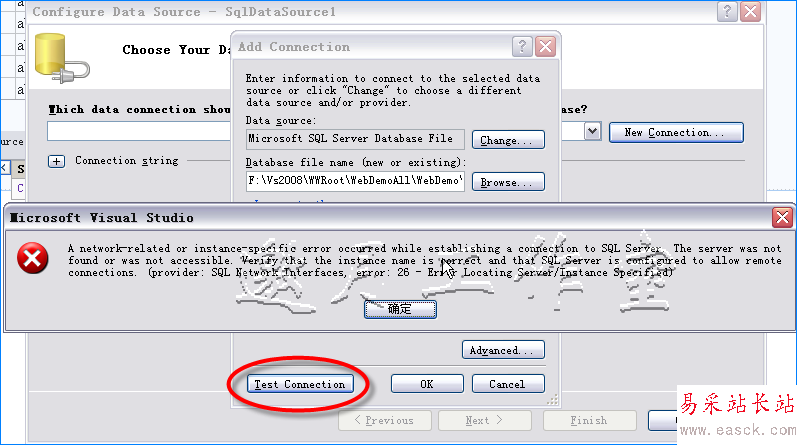 有園子里的朋友問到一個問題:系統上安裝的是vs2008+Sql 2005 developer(沒有安裝Sql server 2005 Express ) 用代碼直接連SQL Server服務器沒有問題,但在項目中數據源改用SQL Server數據庫文件時出錯,提示錯誤如下: “與SQL Server文件(*.mdf)的連接要求安裝SQL Server2005才能正常工作,請確認是否安裝了該組件,……” 英文版為“Connections to SQL Server Files (*.mdf) require SQL Server Express 2005 to function properly. Please verify the installation of the component or download from the URl: http:go.microsoft.com/fwlink/?linkID=49251.”