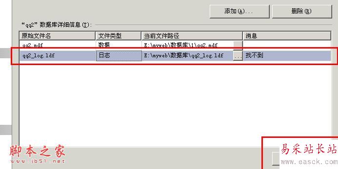附加到剛剛那個 mdf的文件。注意看下面會提示 .ldf 文件找不到。