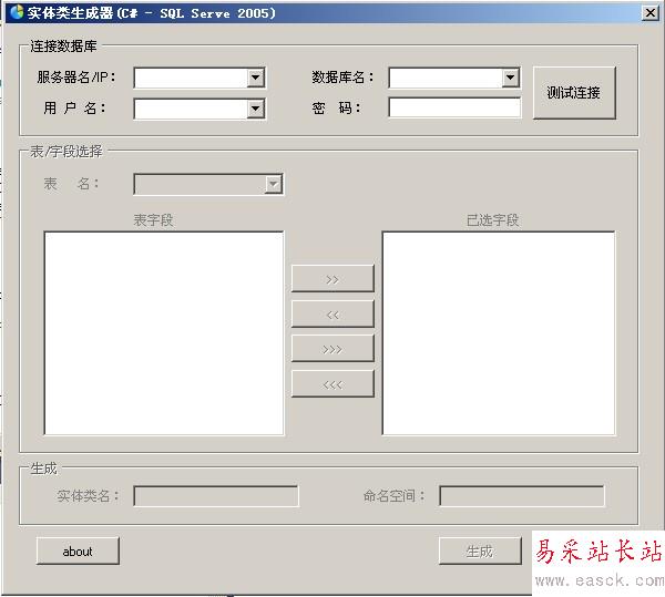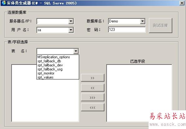 四、選中表名下拉對話框中的任意表名,則程序自動將該表中所有的字段填充到左側ListBox中,此時,你可用選擇需要生成實體類的字段,并移動到右側的ListBox中。如圖(五)