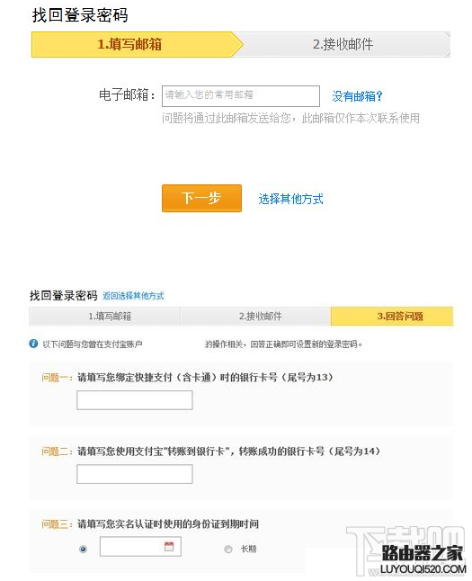接下來會提示你找回密碼的途徑,手機找回最為簡單吶,無論選擇哪種方法,根據提示填寫,然后更改你的密碼后重新登陸就可以了,登陸限制就會被解除的哦~如果遇到什么不可預見的問題,及時聯系支付寶客服即可。郵箱驗證要回答問題哦