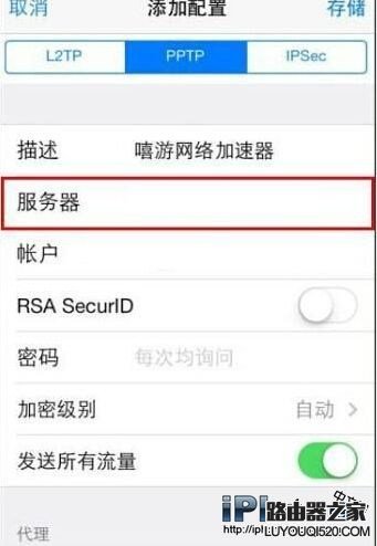 3、在添加VPN中選擇PPTP,點(diǎn)擊進(jìn)入,在“描述”欄中填入嘻游。在服務(wù)器欄中填入能夠使用得服務(wù)器地址:聯(lián)系QQ79490724獲得該服務(wù)器,在賬戶和密碼欄中填入嘻游用戶名和密碼。其他設(shè)置保持不變,然后點(diǎn)擊儲(chǔ)存,注意加密級(jí)別要選擇自動(dòng),不加密連接不上服務(wù)器。