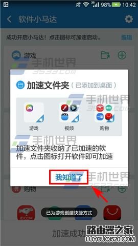 3)此時應用會在桌面添加加速文件夾,點擊【我知道了】,然后回到桌面,從加速文件夾里面進入應用,就可以實現加速了。(如下圖)