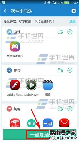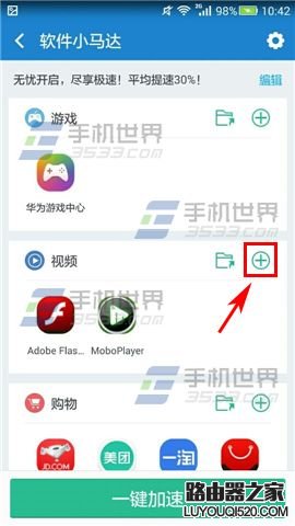 2)找到應用,點擊【添加】,回到【軟件小馬達】頁面,點擊【一鍵加速】;(如下圖)