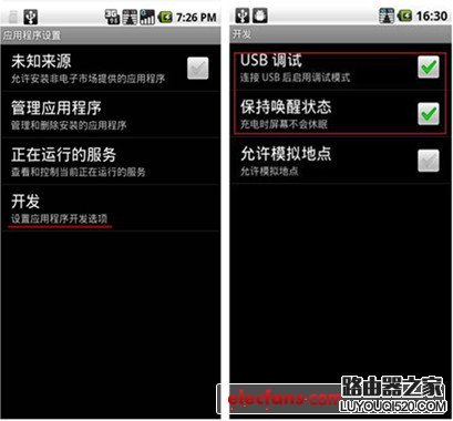 4)勾選“USB調試”,“保持喚醒狀態”;