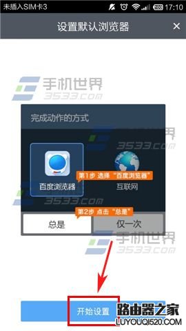 4)再點擊【開始設置】,彈出選項框后,記得要先勾選【默認此項,不再提示】,再選擇【百度瀏覽器】即可設置成功。(如下圖)