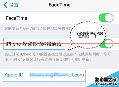 3、接著還需要在 iPhone 上的“設置-FaceTime”里用我們的 Apple ID 來打開 FaceTime 功能,并且還需要在 iPhone 上打開“iPhone 蜂窩移動網(wǎng)絡通話”這個選項,它是讓 iPhone 與 Mac 結(jié)合的必要條件。