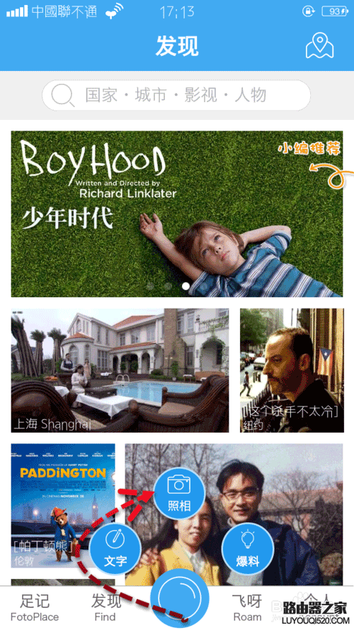 登錄足記,主頁中間底端有一個“圓圈”,點擊圓圈,彈出文字、照相、爆料三個“小圓圈”,點擊照相。