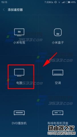 1)打開小米4【小米遙控器】,小編以【電視】為例。PS:如果你的電視有機頂盒的請選擇【有線電視機頂盒】。(如下圖)