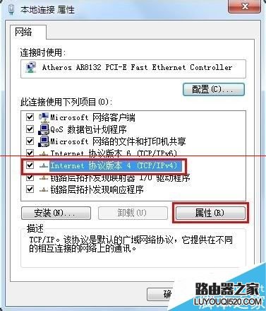 第四步:找到并點擊 Internet協議版本4(TCP/IPv4),點擊 屬性。如下圖所示: