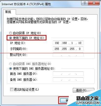 第五步:選擇 使用下面的IP地址(S);設置IP地址為 192.168.1.10,子網掩碼為 255.255.255.0,網關為192.168.1.1,點擊 確定。如下圖所示: