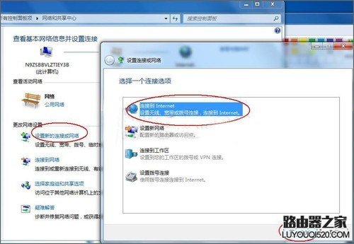 在“網絡和共享中心”這個頁面的中間位置有“更改網絡設置”項,點擊此項的第一個選項“設置新的連接或網絡”,然后在彈出的新窗口中選擇“連接到Internet”(默認選項),點擊“下一步”。(見下圖↓)