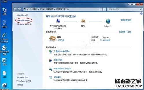 重復以上三種步驟的任何一種,也就是能進入到“網絡和共享中心”這個頁面即可,然后點擊頁面左上角的“更改適配器設置”這個選項。(見下圖↓)