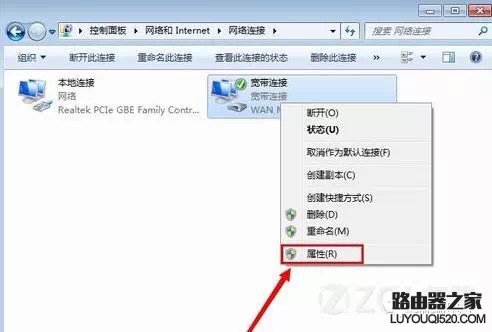 5.右鍵“寬帶連接”,然后點(diǎn)擊“屬性” 如圖